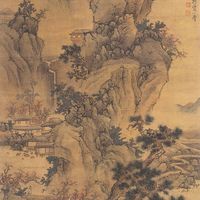元 胡廷晖 春山泛舟图轴绢本青绿